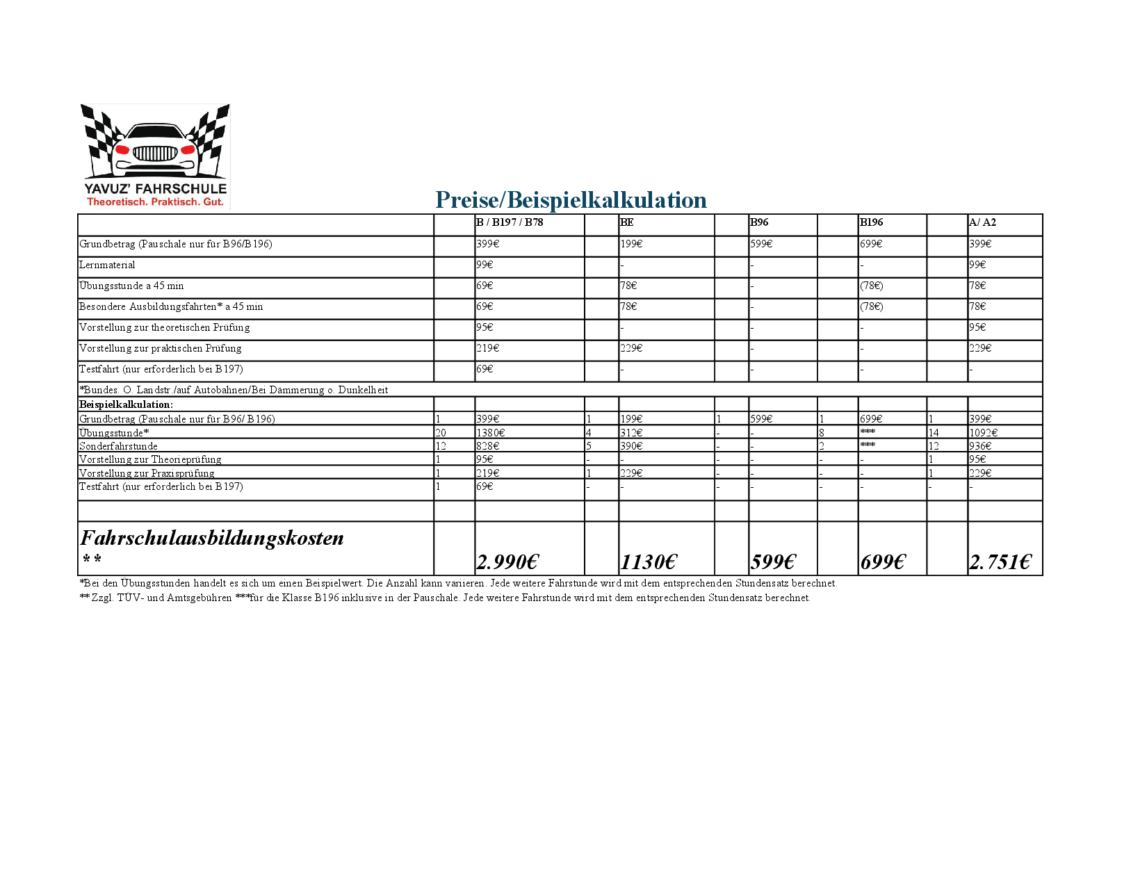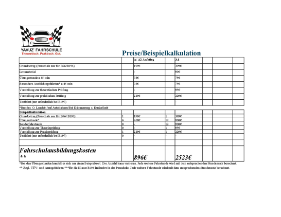 Unsere aktuellen Preise und Beispielkalkulation für folgende KLassen B (197) B78 BE B96 B196 A A1 A2